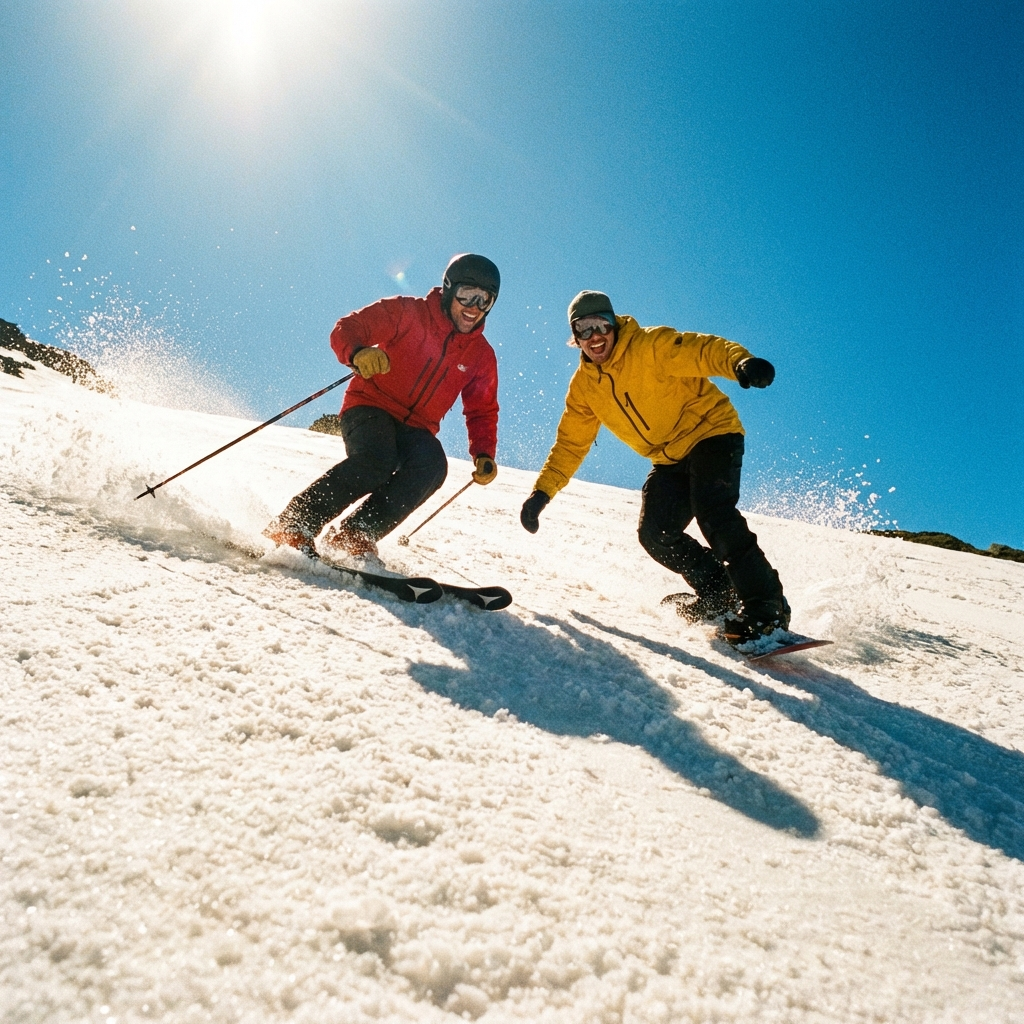 気温が上がり、パーカーや薄手のウェアで滑れます。ザラメ雪(コーンスノー)は板が走りやすく、カービングが最高に気持ちいい季節。